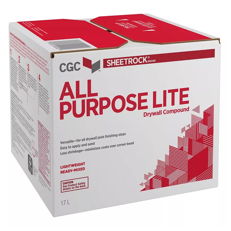 CGC SHEETROCK 17-Litre ALL PURPOSE LITE Lightweight Ready-Mixed Drywall Compound is a ready-mixed, high performance easy-to-use compound that provides superior working qualities and good open time to ensure the smoothest joints possible. This special formulation weighs up to 15% less than conventional-weight compounds and makes it ideal for embedding tape, filling, and finishing joints, fasteners, bead and trim. CGC Sheetrock Brand All Purpose-Lite Drywall Compound is also excellent for skim coating.