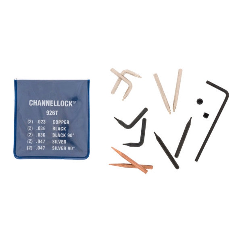 Channellock Set of 5 926 Universal Retaining Ring Tip Kit - CL 926T For use with the 926 6.5" Convertible Retaining Ring Pliers Features: Interchangeable tip kit includes: .023, 039, 047 straight and .039, 047, 90-degree Handy vinyl storage pouch 100% MADE