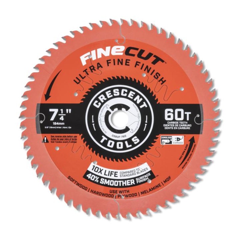 CRESCENT FineCut Ultra Fine Finishing Circular Saw Blade, 7-1/4 in x 60-Tooth - GW CSBUF-760CRESCENT's FineCut Finishing Blades deliver quality cutting performance for a superior finish over the life of the blade. Premium precision carbide teeth slice thro