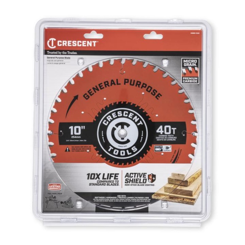CRESCENT General Purpose Circular Saw Blade, 10 in x 40-Tooth - GW CSBGN-1040CRESCENT's General Purpose Blades deliver quality cutting performance for tough demands on the jobsite. Premium Micro Grain carbide teeth slice through wood with ease delivering 1