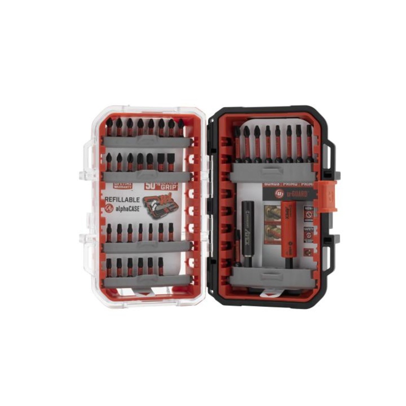 The CRESCENT 38-piece fastening set is built for the most demanding jobsites. The stack and store alphaCASE features a tongue and groove design with thick sidewall construction. The 38-piece set includes a bonus CRESCENT patented non-marring u-GUARD covered bit holder which protect final finishes from damage, and the CRESCENT VORTEX line of torsion bits with optimized tip geometry for fit to the fastener. Screwdriving bit tips include Square, Phillips, Torx, Slotted. Bits are secured in pivoting insert rails inside the case, allowing easy access to bits and case configurability. Slotted 6-8, 8-10, Torx T15 T20 T25, Square PH2.
