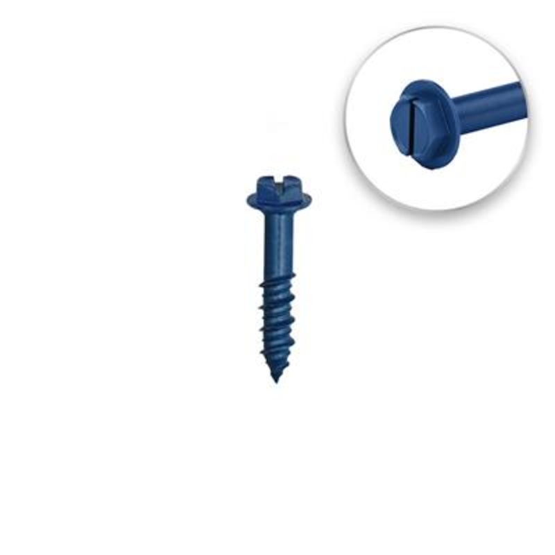 DescriptionDuraDrive 1/4 in x 2-1/4 in Blue Ruspert Coated Hex Washer Head Slot Drive Concrete Screw (100-Pack) has an improved thread design that allows it to anchor sturdily into concrete, brick and block. Using the correct bit (that is included), drill