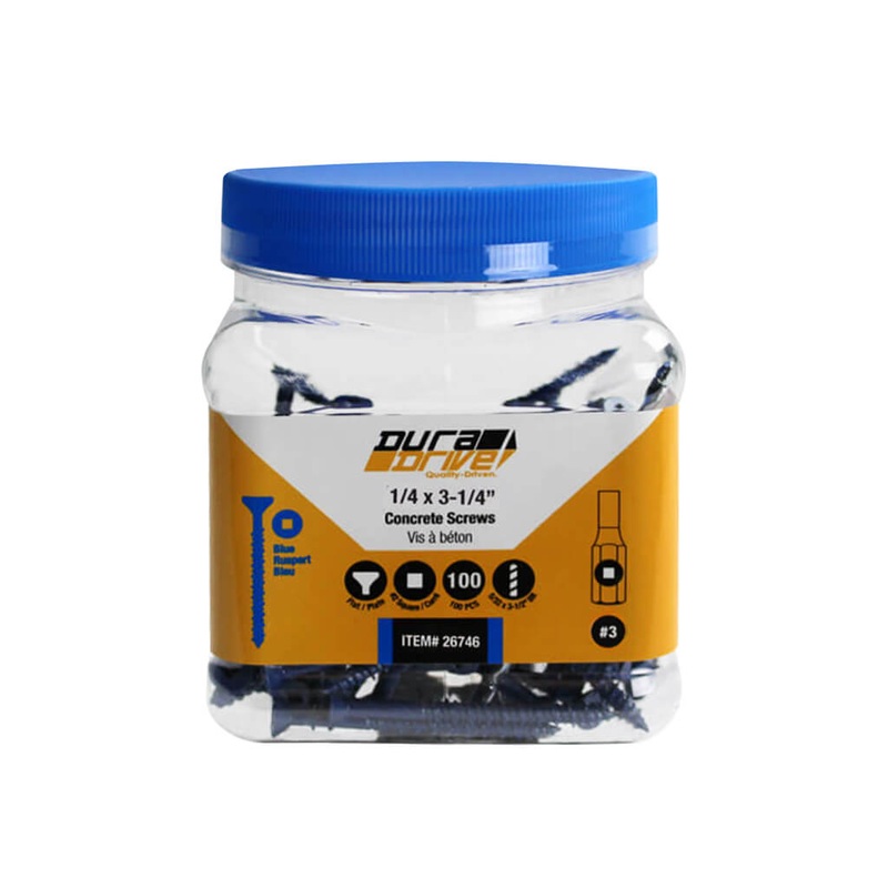 DuraDrive 1/4 in. x 3-1/4 in. Blue Ruspert Coated Flat Head Square Drive Concrete Screw (100-Pack) has an improved thread design that allows it to anchor sturdily into concrete, brick and block. Using the correct bit (that is included), drill hole in mason
