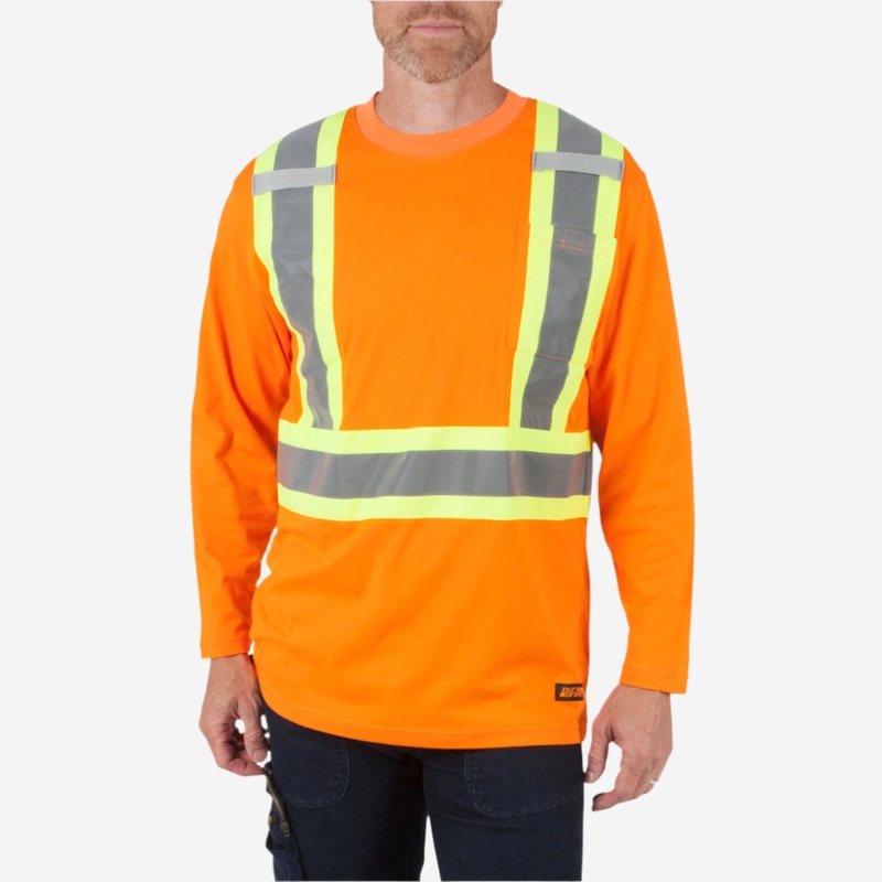 Colour ORANGE Wash Care MACHINE WASH COLD & HANG TO DRY Lined (yes/no) NO Material 100% Cotton Number of Pockets 1 Reflective (yes/no) YES Thermal (yes/no) NO Type (i.e. Shirt, Sweater) Crew Neck T-Shirt Water Resistant (yes/no) NO Hooded (yes/no) NO
