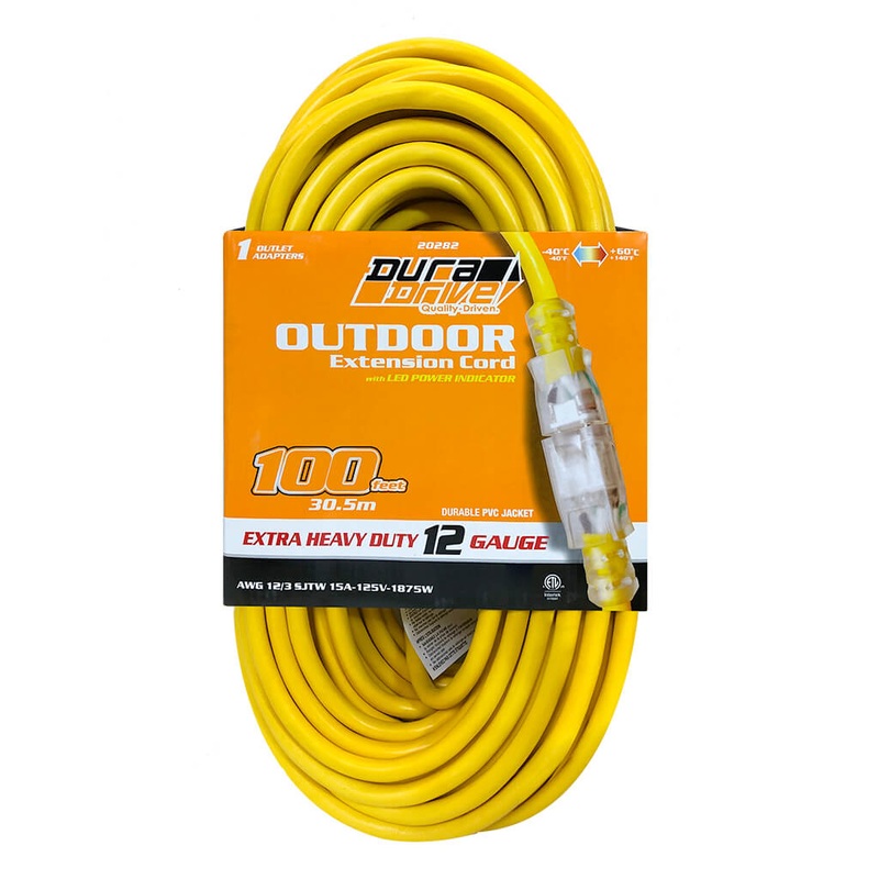 DuraDrive 100 ft. 12/3 SJTW Lighted Single Tap Power Extension Cord can be used both indoors and outdoors. This cord features added length for convenient and versatile use.Features 100 ft. extension cord with lighted connector end Heavy duty 12/3 SJTW type