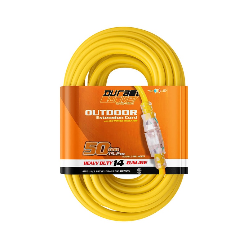 Feature BulletsDuraDrive 50 ft. 14/3 sjtw lighted single tap power extension cord50 ft extension cord with non-locking connector plus built-in power LED indicator lightHeavy duty 14 gauge 13Amp-125V-1625W capacityDurable PVC Jacket for additional strengthO