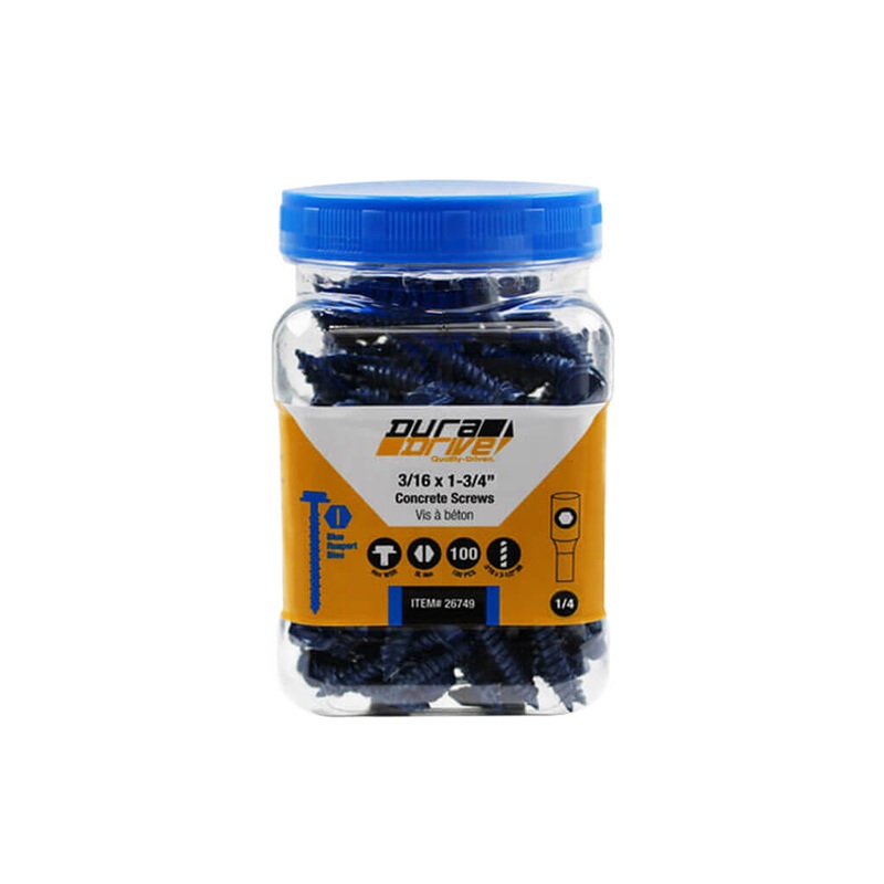 DuraDrive 3/16 in. x 1-3/4 in. Blue Ruspert Coated Hex Washer Head Slot Drive Concrete Screw (100-Pack) has an improved thread design that allows it to anchor sturdily into concrete, brick and block. Using the correct bit (that is included), drill hole in