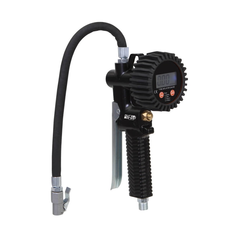 DuraDrive Digital Tire Inflator Gauge Air Hose Fitting for Cars with 12 in. Flexible Hose & Straight Chuck is designed to: measure tire pressure, inflate tires and deflate tires.Features The 12" (300 mm) extension flexible hose with rigid extension and dua