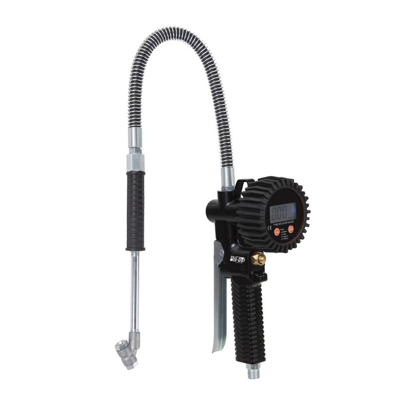 DuraDrive Digital Tire Inflator Gauge for Trucks with 24 in. Flexible Hose & Dual Chuck is designed to: measure tire pressure, inflate tires and deflate tires.Features The 24" (600 mm) extension flexible hose with rigid extension and dual chuck - Ideal for