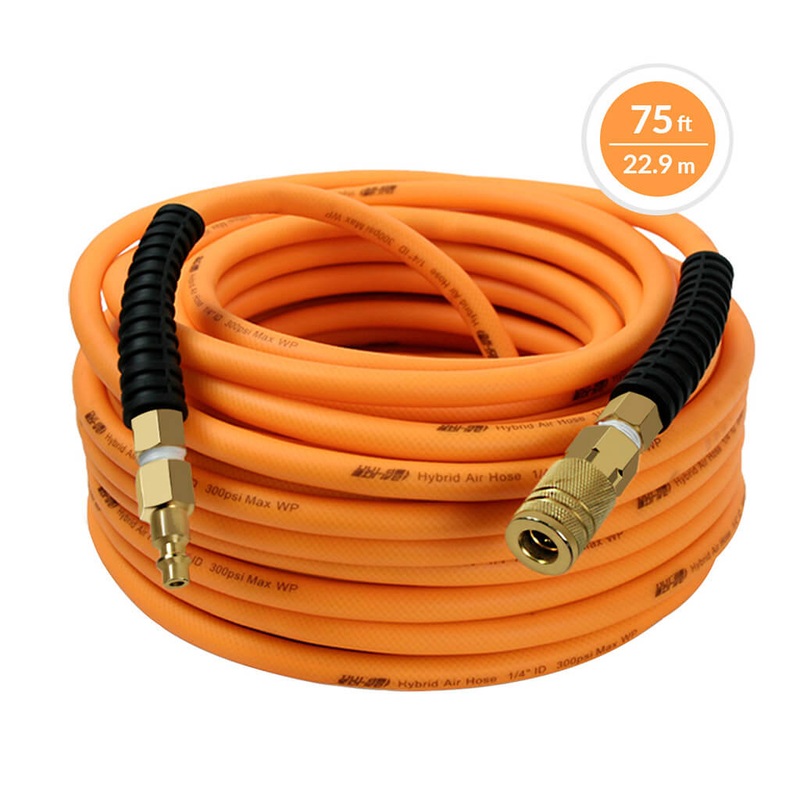 DuraDrive DYPA1475F 1/4 in. x 75 ft. Hybrid Polymer Air Hose with Swivel Fitting is built with durability for prolonged life. With an outer cover resistant to UV, oil and chemicals, the air hose is tough enough to endure rough surfaces, spills and heavy eq