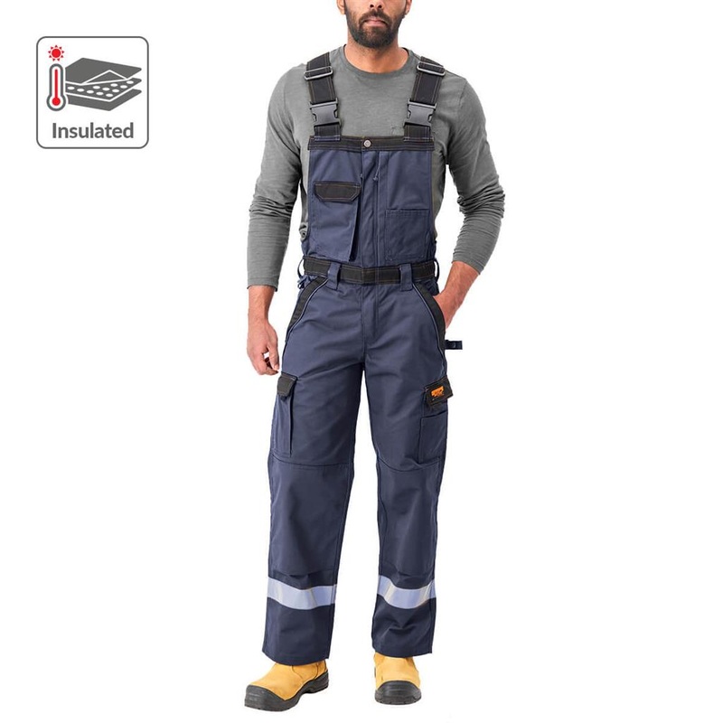DuraDrive Men's TRADESMAN Navy Two Tone Insulated Overall with Hi-Vis Tape is made of 65% polyester, 35% cotton twill fabric and combines comfort, durability and functionality to stand up to the rigorous demands of the workday. The polyester lining and fil