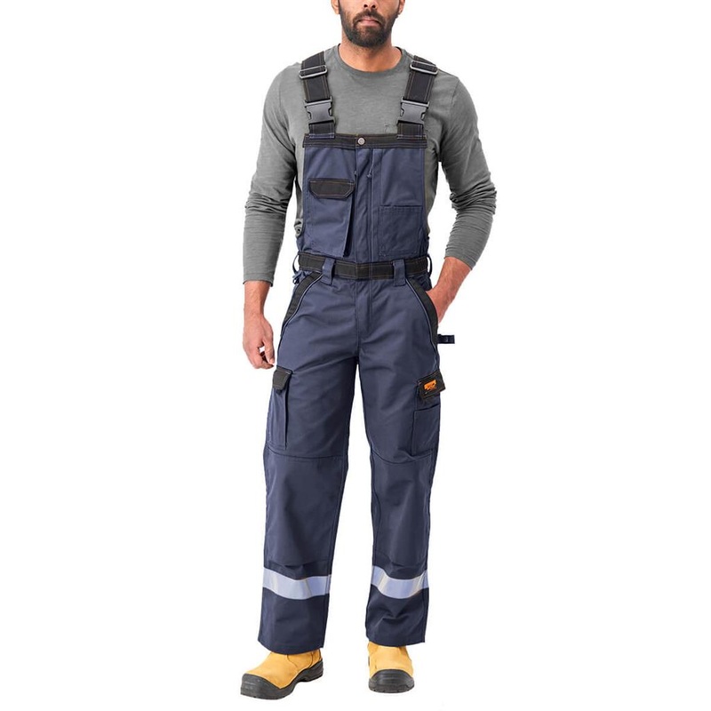 DuraDrive Men's TRADESMAN Navy Two Tone Overall with Hi-Vis Tape is made of 65% polyester, 35% cotton twill fabric and combines comfort, durability and functionality to stand up to the rigorous demands of the workday. The elasticized comfort waistband allo