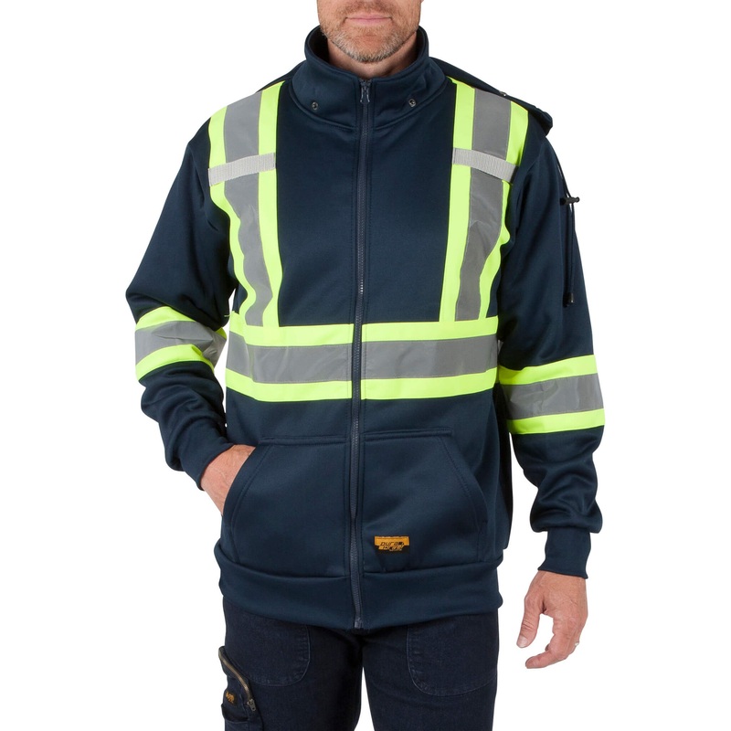 DuraDrive Men's Navy Hi-Vis Class 1 Level 2 Hoodie with Detachable Hood. Theres nothing more comforting than a warm hoodie on a cold day. Working through colder temperatures just got a little easier with DuraDrives Hi-Vis Hoodie. The thick material provide