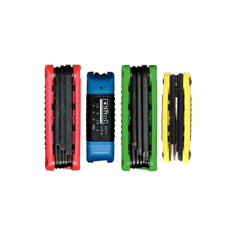 - 25911 – Set of 9 Hex Key Series Ergo-Fold Fold-Up Set with Ergonomic Handle. Sizes- 5/64 – 1/4 in