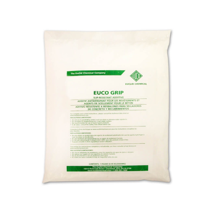 EUCLID 064-95 1-lb. EUCO GRIP Concrete Sealer Additive Admixture is a finely ground polymer added to concrete sealers and coatings for slip resistance, reduction in gloss, and fine texturizing of the surface. EUCO GRIP mixes easily into solvent-based or 100% solids sealers and coatings with little effect on the products sprayability and overall viscosity. EUCO GRIP will stay well suspended in the sealer or coating without the need for constant stirring. The micro-spherical shape of EUCO GRIPs polymer beads provide a smoother feel underfoot when compared to traditional silica sand or other aggregate broadcast systems.