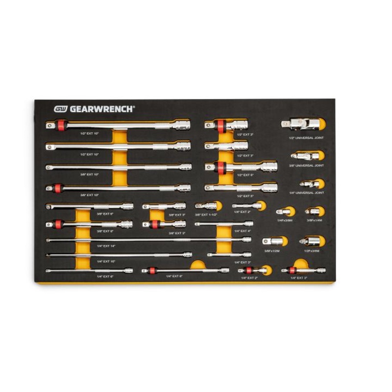 GEARWRENCH 29 Pc. 1/4", 3/8", 1/2" Drive Chrome Tool Accessories Set with EVA Foam Tray 86523 FEATURES Ultimate assortment of 1/4", 3/8", 1/2" drive tools including increasing and reducing adapters, universal joints, and extension bars Bright, full polish