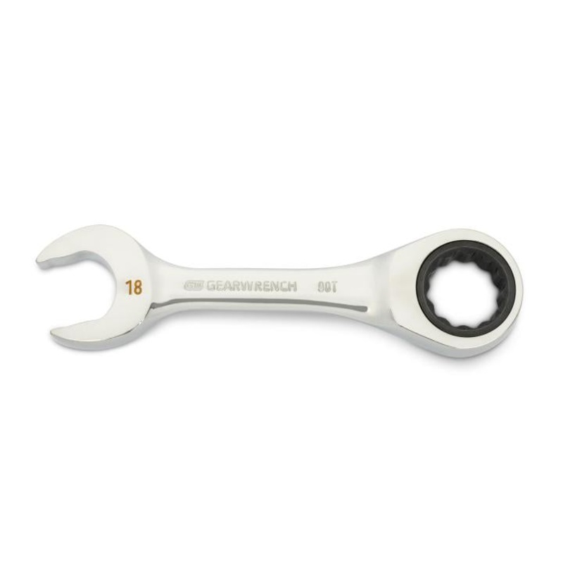 GEARWRENCH 90-Tooth 12-Point Stubby Combination Ratcheting Wrench, 18mm - GW 86848 The GEARWRENCH 90 Tooth combination stubby ratcheting wrenches feature a 4 degree ratcheting arc vs. 30 degree on a standard combination wrench increasing productivity. Thes