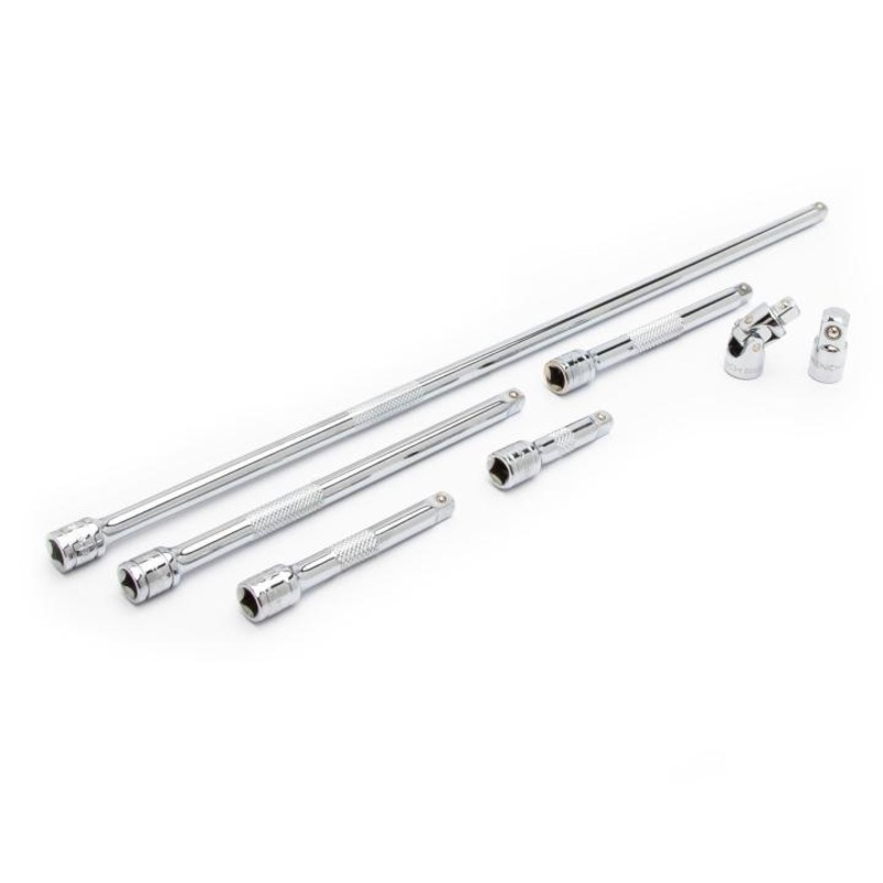 GEARWRENCH Set of 7 1/4 in Drive Tool Accessories - GW 86535 Contains an assortment of extension bar lengths ranging from 2 in up to 14 in to provide access to more fasteners. Extensions, adapter universal joint feature a ball detent for secure socket rete