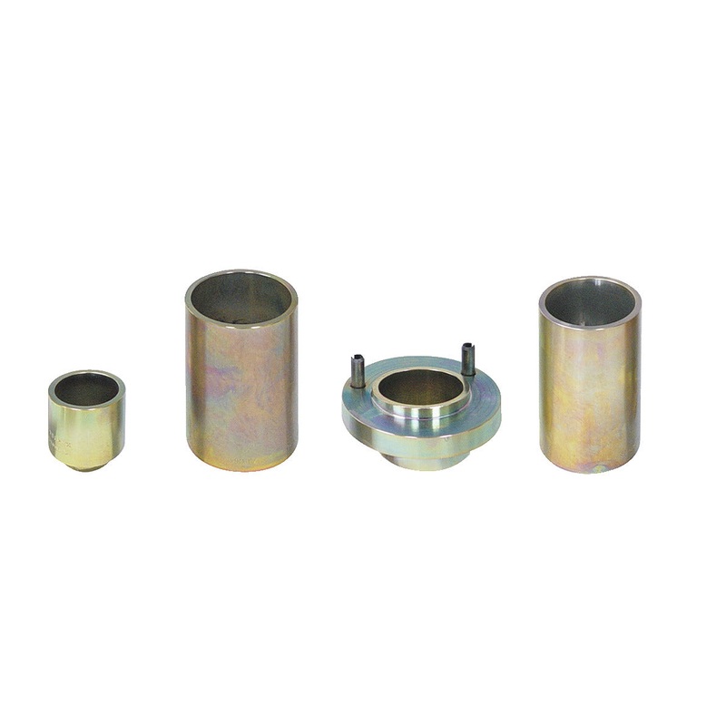 The sleeve set KL-0039-722 is used with Hydraulic Cylinder KL-0040-2500, press frame KL-0039-1140, pressure spindle KL-0039-1930 and retaining adaptor KL-0039-1002, thus allowing for the quick, professional and safe removal and installation of the specified suspension ball joints on the front upper wishbone. This tool enables even heavily corroded ball joints to be pushed out and replaced within just a few minutes. The removal of the upper wishbone is not necessary. This tool enables even heavily corroded ball joints to be pushed out and replaced within just a few minutes. The removal of the upper wishbone is not necessary.