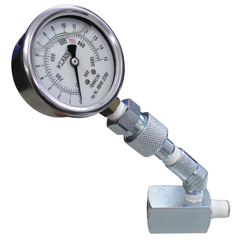 The pressure gauge can be screw-connected between the hydraulic pump and hose so as to allow the hydraulic pressure to be checked during operation. The pressure gauge features an additional tone scale that is specifically adapted to our hydraulic cylinder KL-0040-2200.
