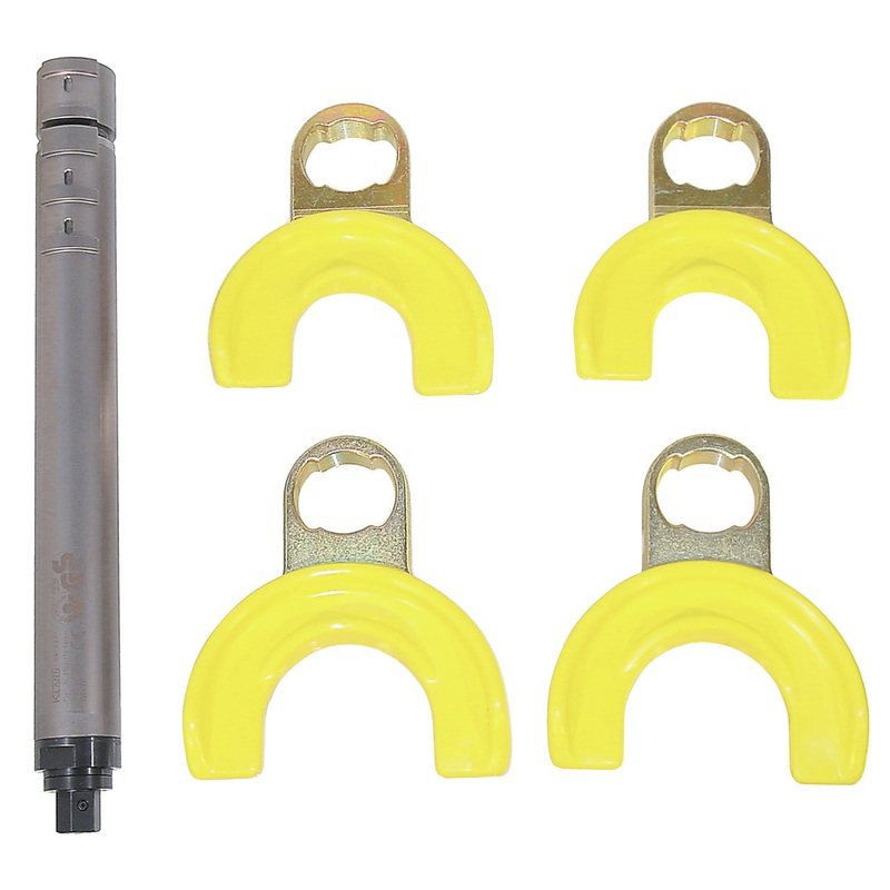 The use of special jaws will also enable coil springs mounted to wishbone suspensions to be removed and installed if space conditions allow. (If necessary, additional jaws can be used.) Comes with pairs of jaws with protective inserts in size 1 and 2 designed for spring diameters of from 100 – 175mm. Additional jaws for spring Diameter of from 70 – 210mm are available as accessories. Max. Load Capacity 27 500 N, at the specified 4-times Safety Factor, the maximum load capacity of the spring compressor is 27 500 N. THE unique universal telescopic spring compressor – which, due to a special latching system, allows the jaw openings (distance between jaws) to be adjusted from a minimum distance of 40mm to a maximum of 361mm. This is an important feature when it comes to compressing very short springs (2-3 coils) but also very long springs so as to allow all these to be fully de-compressed and/or replaced (e.g. Audi, BMW, Fiat, Ford, Lancia, Mazda, Mercedes, Renault etc.). which features a patented Bayonet Interlock System with an automatic self-locking mechanism designed to safely fix the forged jaws to the compressor body (no tools, bolts or locking rings required). whose spindle drive remains closed if the safety pin shears off. Thanks to the auxiliary drive, the compressed spring can then be decompressed to enable a new safety pin to be installed. which is equipped with an automatic free-wheel designed to prevent the spindle from overload during the decompression process once the maximum end of travel has been reached – thus eliminating the risk of damage to the spring-compressor. which enables the plastic protective inserts protecting the coating of the spring, to be screw-connected to the jaws. This is very important to prevent spring failure/breakage caused by notches and corrosion. which is suitable for almost any MacPherson suspension / damper strut systems, as well as for many other wishbone suspensions – thanks to a wide range of jaws available. Thanks to the interaction of special high-precision components and the use of wear-resistant nitride steel, the compressor body not only is smooth-running but also highly resistant to wear and tear. To compress a spring having a coil-bound force of approx. 18 000 N (for example of a Mercedes M-Class) a torque of only 35 Nm is required. Examples of maximum spring coil-bound forces: VW Polo approx. 6 000 N. VW Golf approx. 7 000 N. VW Passat approx. 8 000 N. Audi A4 approx. 9 000 N. Mercedes Vito approx. 14 200 N. Peugeot Boxer approx. 15 000 N. Fiat Ducato approx. 15 000 N. MB M Class approx. 18 000 N. BMW X5 approx. 18 000 N. The foam insert of the KL-4999-131. Series included in the kit allows for the safe and clearly arranged storage of the tool components. Including spring retainer pairs size 1 and 2 for a spring diameter of 85 mm (inside) – 170 mm (outside). Further spring retainers for spring diameters of 60 (inside) – 205 (outside) available. Maximum load capacity 27 500 N (in case of the prescribed 4-fold safety, the maximum load capacity of the spring retainer is with 27 500 N.) The universal spring retainer,, with which the minimum spanner size (opening width) is adjustable to 40 mm and the maximum to 361 mm due to a grid system. This is important when tensioning very short springs (2 – 3 spring coils) and in case of very long springs, in order to completely release or renew them, where the forged spring retainers are fixed with a bajonet lock system with automatic lock (tools, screws and screw rings are not needed), where the spindle drive stays closed, when the locking pin shears off. The compressed spring can then be released via an auxiliary drive, in order to install a new locking pin, where a spindle overload during the release process when the maximum operating stroke is reached, is prevented by an automatic free-wheel. Important to avoid damage to the spring retainer, with plastic protective inserts that can be screwed with the spring retainers in order to protect the spring paint surface. Important to avoid spring fractures due to notch and corrosion effects, which can be used on nearly all MacPherson suspension strut axles, damper strut axles and in part on some wishbone axles due to a large spring retainer assortment. Due to the interaction of high-precision individual components and the use of wear-resistant nitriding steel, the compressor cylinder works very smoothly and nearly without any wear. For example, tensioning of a Mercedes M-Class spring with a block force of approx. 18 000 N, only requires a driving force of 35 Nm. Pros: Simple handling regardless of large forces, Spring retainer attachment with automatic engagement, Adjustment of spanner sizes, Drive with additional auxiliary drive, Automatic free-wheel of the spindle, Can be also used for conical springs, Plastic protective inserts included.