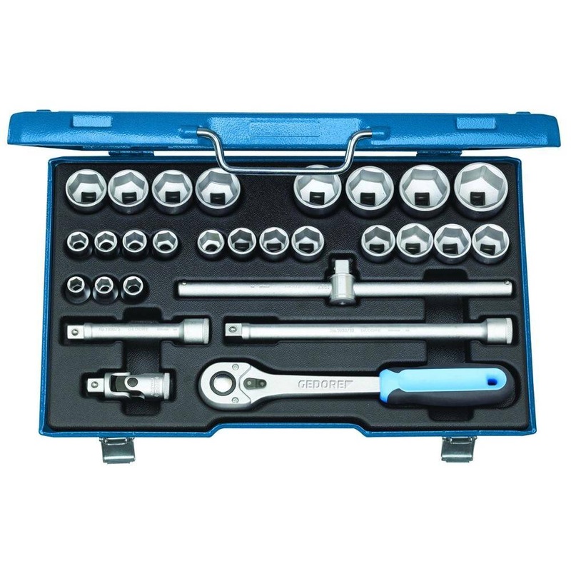 With forged, tempered hexagon (no.19) or UD profile sockets (no. D 19), hand-operated. With accessories made from Gedore vanadium steel 31CrV3. With reversible lever change ratchet, with push-button release. In Gedore blue sheet steel case. Dimensions: 425 x 277 x 55 mm.