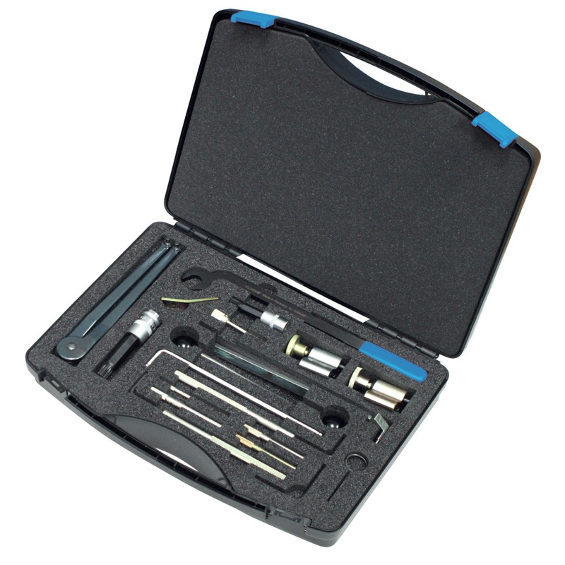 Designed to be used for the locking/positioning of engine shafts such as camshaft, injection pump shaft and crankshaft. The kit also includes tools to lock/position and adjust the timing belt tensioner. An indispensable tool set when replacing a timing belt or performing an engine repair. Scope of Delivery: KL-0149-131 Pin-Type Face Spanner, Diameter 14 – 100mm, pin- Diameter 5mm. Designed to hold the pulley in position when removing/installing the Viscos-Fan. KL-0180-3024 Retaining Pin, Diameter 2.4mm. For locking the timing belt tensioner. KL-0280-16 Holding Tool. For locking the timing belt tensioner. KL-0280-19 Locking Tool. For locking the crankshaft sprocket. KL-0280-20 Locking Tool, 2.0 TDI, PD. For locking the oval crankshaft sprocket. KL-0280-2201 A Locking Pin (angled), Diameter 2.5mm. For locking the timing belt tensioner. KL-0280-2202 A Special Hexagon Socket Key, size (waf) 6mm. For positioning the timing belt tensioner. KL-0280-221 Locking Pin, Diameter 4mm, angled. For adjusting the timing belt tensioner. KL-0280-222 Locking Pin, Diameter 4mm, angled. For locking the timing belt tensioner. KL-0280-2501 Locking Pin, Diameter 4.4mm. For locking the auxiliary drive belt tensioner (V-ribbed belt). KL-0280-6101 Locking Pin, Diameter 4mm. For adjusting the timing belt tensioner. KL-0280-6102 Locking Pin, Diameter 7mm. For adjusting the timing belt tensioner. KL-0284-91 A Adjustment Tool for Timing Belt Tensioner, 240mm. For positioning the timing belt tensioner. KL-0284-92 Tension Pulley Spanner (waf 16mm). For positioning the V-ribbed belt tensioner. KL-0286-11 Guide Pin Set for Front-End Carrier. These guide pins are used to slide the front-end carrier forward (to service position). As a result, the removal of the front-end carrier is no longer necessary. KL-1480-16 Locking Pin, Diameter 6mm, long. For locking the injection pump sprocket. For positioning the camshaft. KL-4031-3610 Screwdriver Bit Socket XZN-M10. For loosening/tightening the fastening screws of the high pressure fuel pump sprocket. KL-4031-3114 Screwdriver Bit Socket XZN-M14, 100mm. For loosening/tightening the balancer fastening screws. KL-4990-7029 Plastic Storage Case. Required when changing the timing belt or repairing the engine.