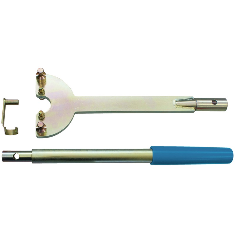 This tool is designed to counter-hold pulleys, timing belt sprockets etc. It is required when loosening/tightening the fastening screw. The locking takes place either via the pins ( Diameter 11.5mm) which engage the holes of the pulleys/timing belt sprockets, or by fixing the reaction wrench to the crankshaft timing belt sprocket by means of the M8 bolt. Thanks to its special length of 704mm, this tool allows even very tight-fitting or stubborn fastening screws to be loosened with ease. It is required when loosening/tightening the fastening screw. The locking takes place either via the pins ( Diameter 11.5mm) which engage the holes of the pulleys/timing belt sprockets, or by fixing the reaction wrench to the crankshaft timing belt sprocket by means of the M8 bolt. Thanks to its special length of 704mm, this tool allows even very tight-fitting or stubborn fastening screws to be loosened with ease.