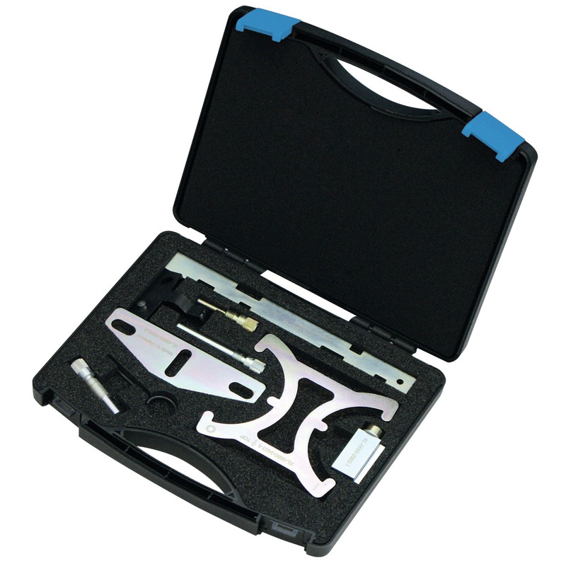 Designed for the locking/positioning of camshaft, crankshaft and timing belt tensioner. The kit also includes a tool to adjust the VCT unit. An indispensable tool set when replacing a timing belt or performing an engine repair. Scope of Delivery: KL-0680-18 Locking Pin for Crankshaft. For locking the crankshaft. KL-0180-3024 Locking Pin, Diameter 2.4mm. For locking the timing belt tensioner. KL-0680-2403 A Setting Gauge for Camshaft. For locking the camshaft sprockets/VCT unit. KL-0680-2404 A Locking Tool for Flywheel. For locking the flywheel. KL-0680-15 A Setting Gauge for Camshaft. For locking the camshafts. KL-0680-17 Locking Pin for Crankshaft. For locking the crankshaft. KL-0680-16 A Locking Pin for Crankshaft. For locking the crankshaft. KL-0680-2405 A Locking Tool for Vibration Damper. For locking the crankshaft vibration damper. KL-0680-2490 A Plastic Storage Case. An indispensable tool set when replacing a timing belt or performing an engine repair.