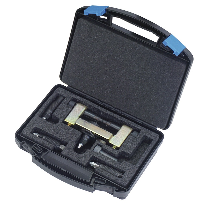 In order to be able to pull stuck shock absorber units out of the steering knuckle clamping bore or suspension joints out of the lower suspension joint mounting without damage, it is absolutely necessary to widen the clamping bore properly with an expanding tool. The expansion tool set enables both the suspension strut clamping bore and the lower suspension joint mount on the front axle to be expanded professionally. Required, for example, when changing the spring, the shock absorber and the suspension joint. The floating bolts prevent the expansion tool from tilting, and the special expansion wedge with stop prevents the clamping bore from expanding too much. This prevents damage to the cast or aluminum steering knuckle housing or other chassis components due to unprofessional removal and installation attempts. Due to the variably adjustable spreading head, even vehicles where the clamping slot is offset off-center pose no problem.