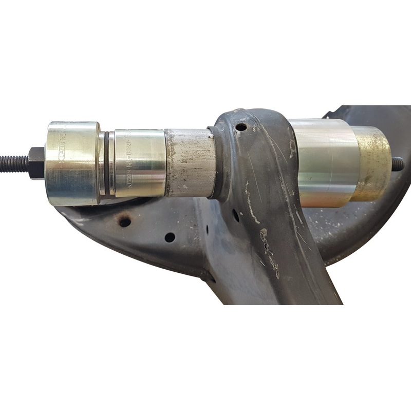 The supplementary kit, in conjunction with the press frame KL-0326-1000 as well as the required drive parts, enables the lower spring control arm silent block on the rear axle beam to be quickly removed and installed directly on the vehicle. A time-consuming removal of the rear axle beam is not necessary. When dismantling the suspension link, the fastening screw, which is directly in the silent block, breaks off very often, so that the removal with a pull spindle is no longer possible. Together with the thrust spindle, the special press frame KL-0326-1000, which is used when removing the silent block, makes the use of a pull spindle unnecessary. Note: Alternatively, it is also possible to remove the silent block without the press frame – KL-00326-1000 and thrust spindle KL-0039-1930. However, the hole on the silent block must be continuous, and the support sleeve – KL-0039-1772 (accessory) is also required.