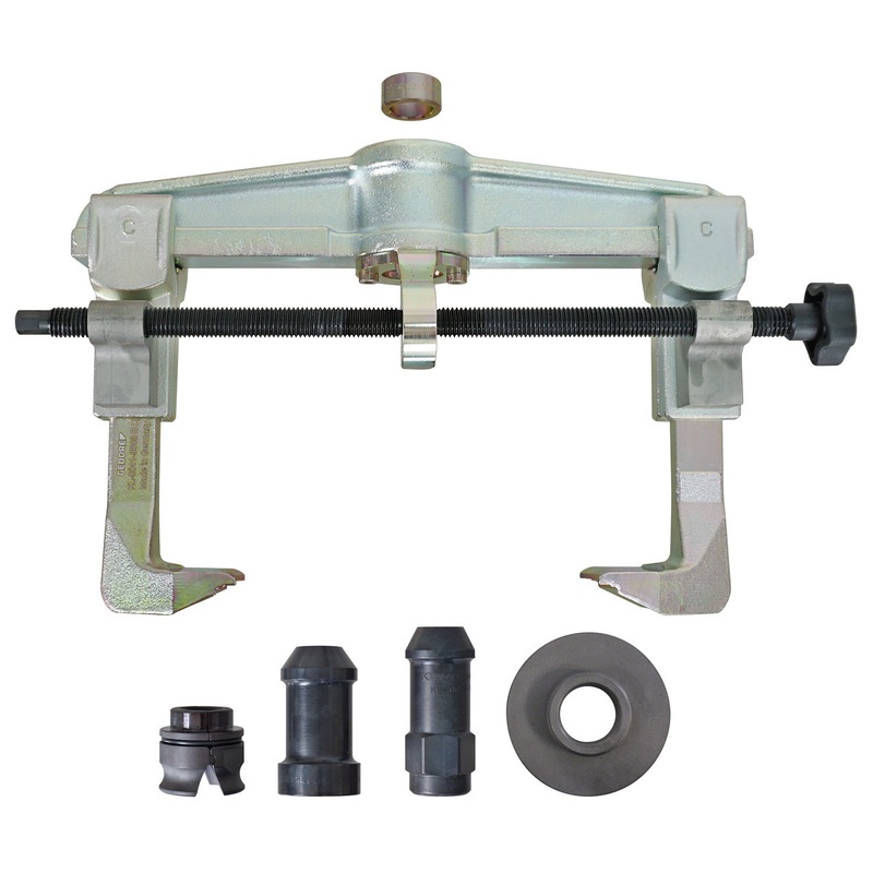 For quick, safe, and precise pulling out of wheel hub wheel bearing units, wheel hubs, and wheel bearings from the wheel bearing housing. Even bonded, stuck, or corroded wheel hub wheel bearing units, wheel hubs, and wheel bearings are no problem for the wheel hub extractor’s design which can be subject to loads of up to 12 tones. This tool can be also used for mechanically forcing out the cardan shaft.