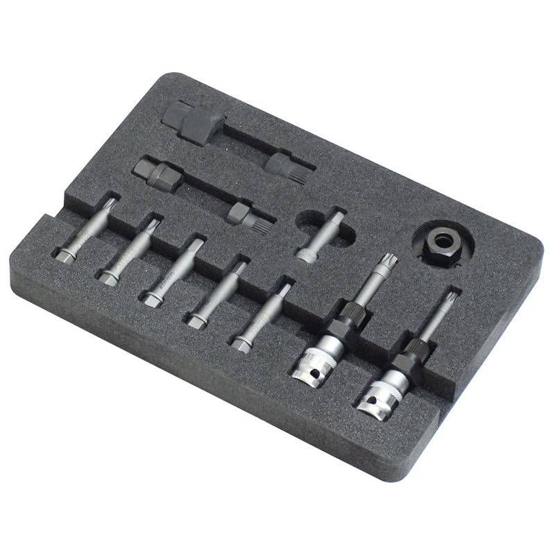The alternator socket wrench set enables the professional loosening, tightening and simultaneous counter-holding of the overrunning pulley on the alternator. Necessary because alternators with freewheel cannot be held against the outside via the belt pulley for release. The special screwdriver inserts and union nuts can be combined with each other as required. This results in a universally suitable range for a large number of alternators.