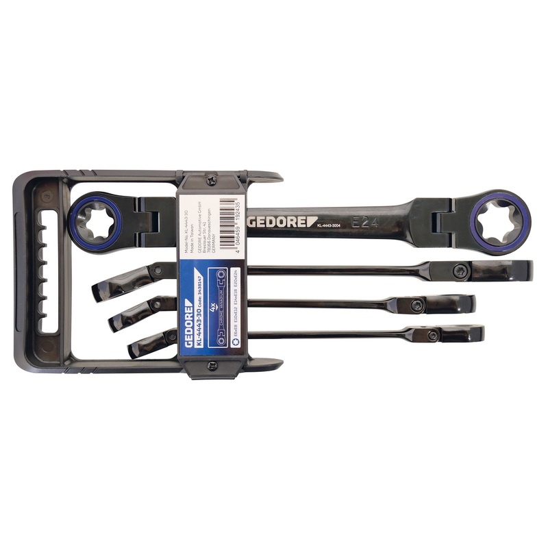 - 1 x Double articulated ratchet ring spanner – E6/E8, 1 x Double articulated ratchet ring spanner – E10/E12, 1 x Double articulated ratchet ring spanner – E14/E18, 1 x Double articulated ratchet ring spanner – E20/E24